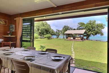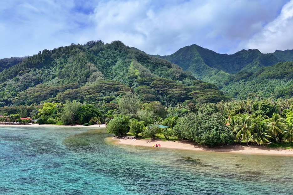 Between a turquoise lagoon and majestic mountains, this traditional fare nestled on 1,500 m² of lush greenery offers a private beach, a typical fare pote’e, and breathtaking views. Two bedrooms, fully equipped kitchen, BBQ gaz... Just steps from the dolphin pass and the Tiki Village, experience the essence of Moorea here — where nature, comfort, and Polynesian magic come together.