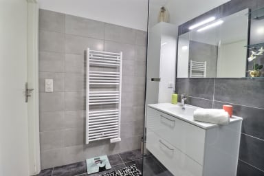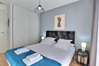 The sleeping area features two welcoming bedrooms, each furnished with a 160 cm queen-size bed and designed to ensure optimal comfort. The layout is well balanced, with built-in storage and a soothing ambiance. Every detail has been carefully considered to guarantee serenity and quality throughout your stay.