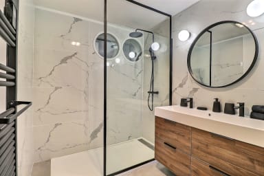 À l’étage, trois chambres élégantes avec lits queen-size offrent un confort optimal. Leur décoration épurée rappelle la douceur des paysages provençaux. Une salle de bain moderne complète cet espace dédié à la détente et au repos.