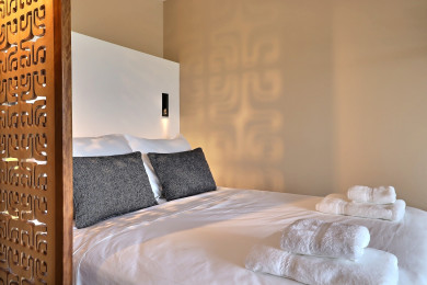 L’appartement, entièrement climatisé, dispose d’un espace nuit confortable séparé par une élégante cloison décorative, d’un coin repas convivial et d’une cuisine moderne équipée de tout le nécessaire, incluant machine à café, plaques de cuisson et lave-linge. Le wifi haut débit et la TV connectée garantissent à la fois divertissement et praticité.