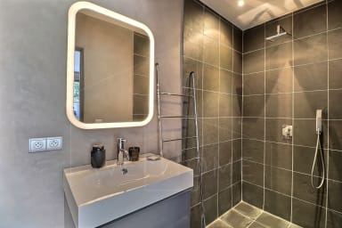 À l’extérieur, au cœur du jardin paysager de 2 500 m², se trouve une chambre indépendante située côté piscine. Accessible uniquement par l’extérieur, elle constitue un véritable cocon de tranquillité. Cette chambre, équipée d’un lit en 160 x 200 cm et d’une salle d’eau privative, conviendra parfaitement à un couple souhaitant plus d’intimité ou à des invités en quête de calme.