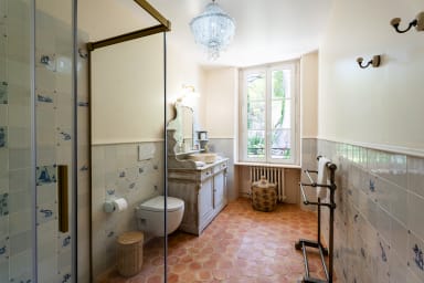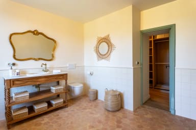 Un escalier en pierre, aux marches recouvertes de tomettes anciennes, conduit à l’étage supérieur. Là, quatre chambres élégantes attendent les hôtes. La première est une suite parentale raffinée, aux volumes généreux, dont la salle de bain attenante en pierre naturelle offre une baignoire posée face au jardin, ainsi qu’une grande douche à l’italienne. Les matériaux choisis, la lumière douce et la palette minérale en font un véritable cocon de repos. Deux autres chambres se partagent une salle de bain avec baignoire, parfaite pour une fratrie ou des enfants. La quatrième chambre, située légèrement à l’écart, bénéficie de sa propre salle d’eau, offrant à ses occupants une autonomie précieuse.